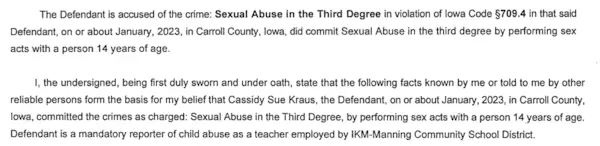 Cassidy Sue Kraus, 24 gadus veca vidusskolas lasīšanas skolotāja, kura ziņots augustā izvēlējās atkāpties no amata, nevis sagaidīt atlaišanu no darba IKM-Manning Community School District (CSD), pašlaik viņai ir izvirzītas apsūdzības par trešās pakāpes seksuālu vardarbību un divas apsūdzības par nelietīgām darbībām ar bērnu, kā arī trīs apsūdzības par pārkāpumiem par iespējamu neķītru materiālu izplatīšanu trim dažādiem bērniem 20232 un Snapchat 2023 gadu laikā.
